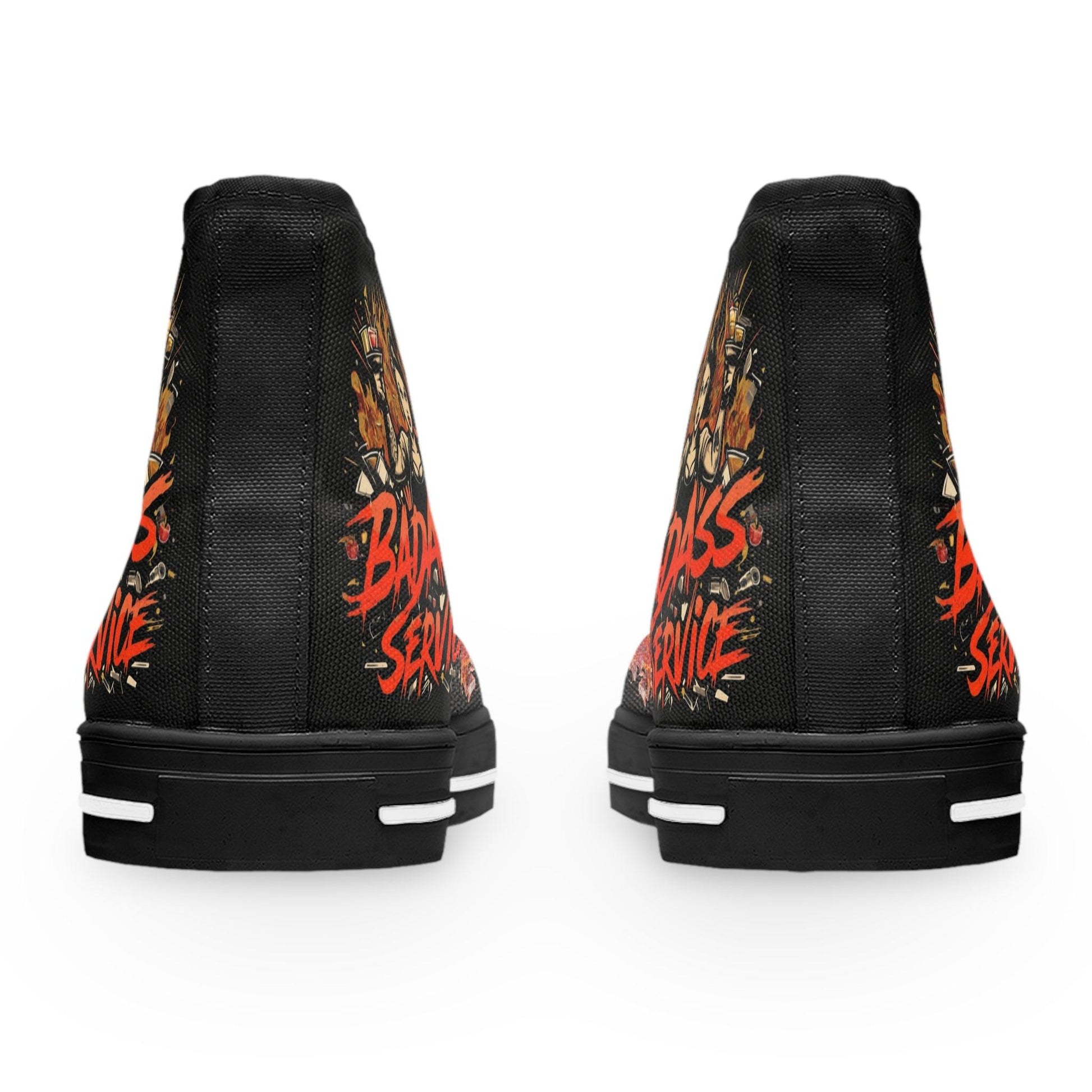 Flame On – Women’s Black High Top Sneakers with Edgy Bartender Design Set your style on fire with these bold and edgy women’s high-top sneakers!